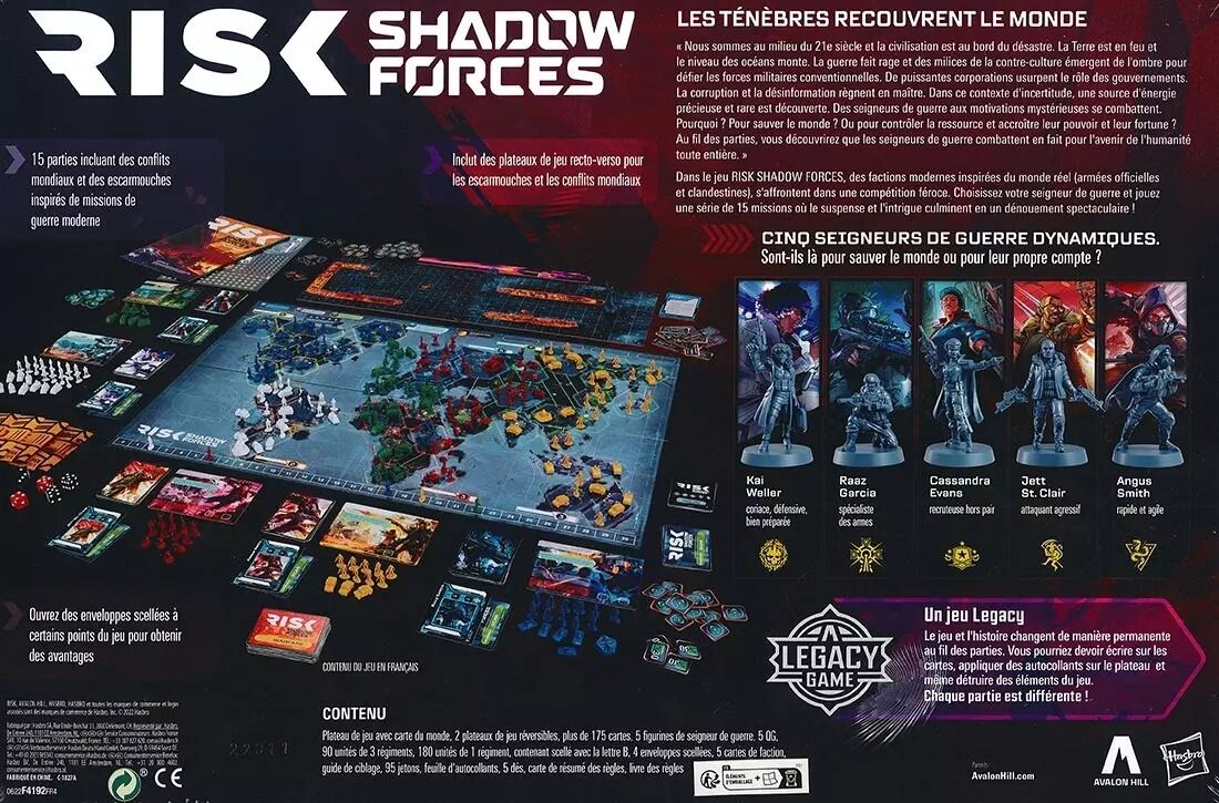 RISK Shadow Forces est un jeu de style Legacy. Vous allez écrire sur votre jeu, le marquer, y mettre des autocollants et même en jeter des parties. Chaque jeu joué changera chaque jeu futur. Tous les joueurs façonnent l'évolution de leur monde ; son histoire, ses villes, même ses factions et comment elles se battent. Les cartes et les autocollants entreront en jeu. Déverrouillez de nouvelles règles et regardez les événements se dérouler à chaque partie. Il n'y aura jamais deux jeux identiques.