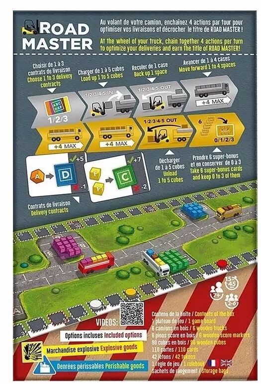 Avec des cubes de bois de plusieurs couleurs, des cartes précises et un plateau modulaire, chaque partie se renouvelle grâce aux contrats variés et aux aléas fluctuants. Road Master s’impose comme un incontournable pour ceux qui aiment réfléchir, anticiper, et revivre la tension d’une course de poids lourds.