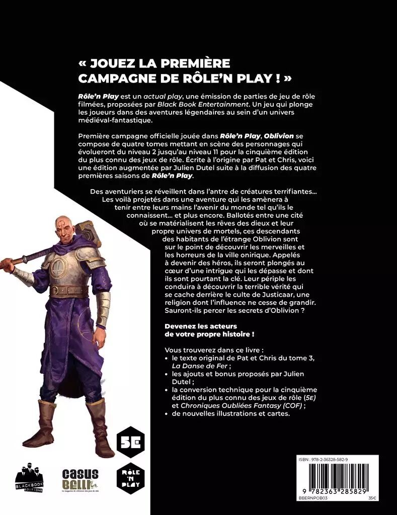 Première campagne officielle jouée dans Rôle’n Play, Oblivion se compose de quatre tomes mettant en scène des personnages qui évolueront du niveau 2 jusqu’au niveau 11 pour la cinquième édition du plus connu des jeux de rôle. Écrite à l’origine par Pat et Chris, voici une édition augmentée par Julien Dutel suite à la diffusion des quatre premières saisons de Rôle’n Play.