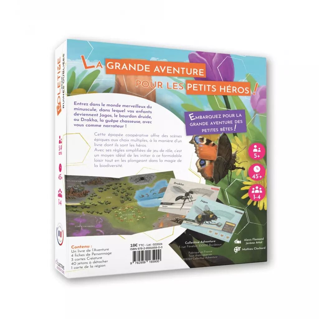 Cette épopée coopérative offre des scènes épiques aux choix multiples, à la manière d’un livre dont ils sont les héros. Elle propose également des règles simplifiées de jeu de rôle, un moyen idéal de les initier à ce formidable loisir tout en les plongeant dans la magie de la biodiversité. Embarquez pour la grande aventure des petites bêtes !