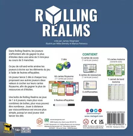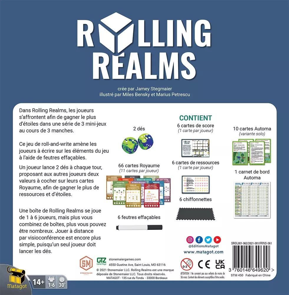 Réf. : MATROL001962 Face à la contrainte de l'isolement imposé au début de la pandémie du Coronavirus, Jamey Stegmaier a décidé de créer un jeu de roll-and-write à grande échelle permettant de jouer à distance via Facebook Live : Rolling Realms. Chaque "Royaume" de Rolling Realms est directement inspiré d'éléments des autres jeux Stonemaier game.