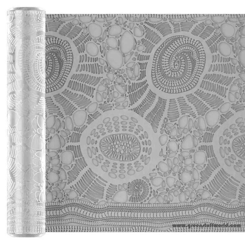 Dans le cas de la résine vert Green Stuff, qui est particulièrement collante, il faudra mouiller les rouleaux avec un peu d'eau avant texturation. On peut également réduire l'adhérence de cette mastic appliquant poudres de talc, ou même avec de la vaseline de modélisation (LINK).
