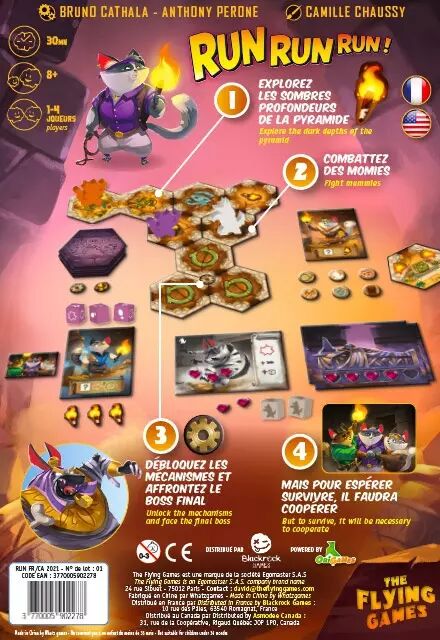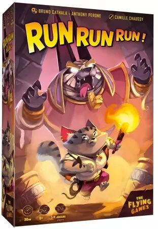 Dans Run Run Run, les joueurs vont devoir se créer un chemin à l'intérieur de la Pyramide et combattre les Momies qui vont se réveiller durant la partie. Au cours du jeu, les joueurs vont gérer leur main de cartes Lieux. Afin d'avancer dans l'aventure, ces cartes Lieux auront une triple utilité : 1. Elles servent à construire le labyrinthe et ainsi déclencher les mécanismes Porte. 2. Elles servent de points de vie (si un des joueurs n'a plus de cartes en main, toute l'équipe a perdu). 3. Elles devront être dépensées pour combattre les momies.