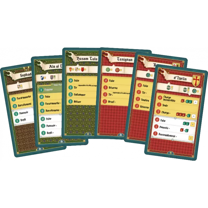 Saladin est un jeu d’affrontement pour 2 joueurs. Après avoir choisi l’un des deux scénarios de bataille et placé les éléments nécessaires, chaque joueur, à tour de rôle, va commander l’une de ses bannières. Il la fera combattre afin de désorganiser celles de son adversaire. Pour cela il lui faudra dépenser des jetons ordre dont le nombre diminuera au début de chaque tour de jeu.