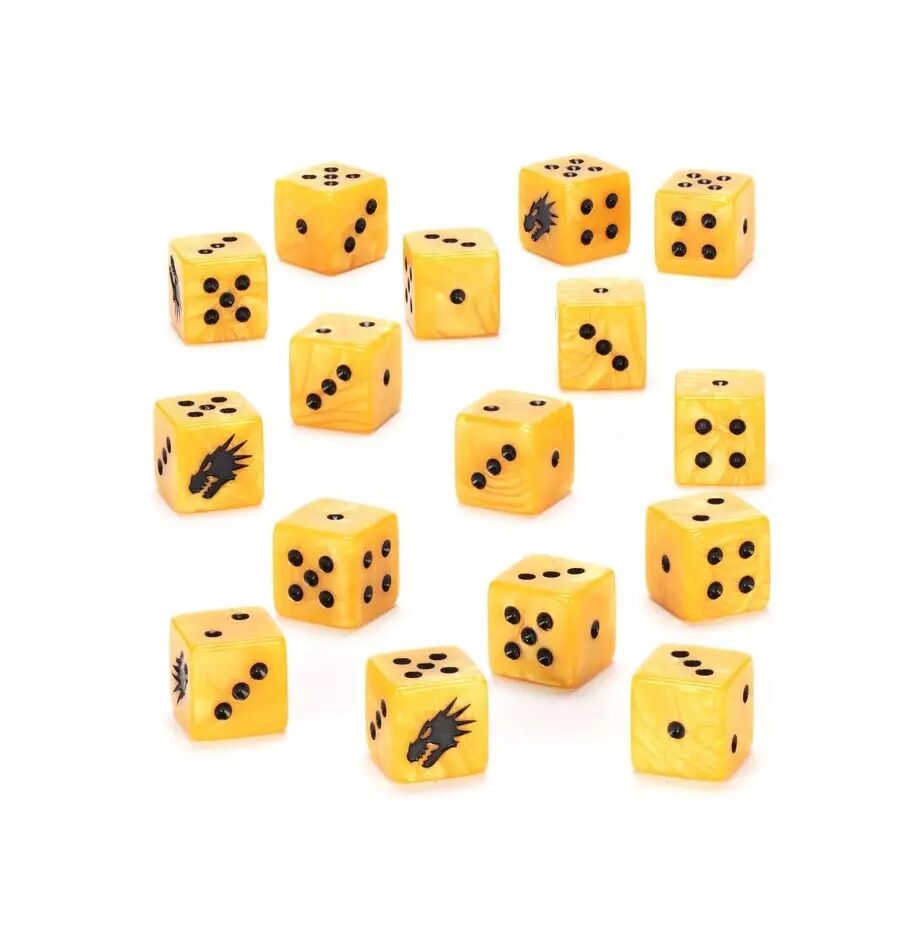 Ce set de 16 dés aux arêtes carrées pour les parties de Warhammer 40,000 est sur le thème des Salamanders. Ils sont moulés en plastique acrylique orange flamboyant avec des marquages noirs et ils mesurent 16mm de côté. Les faces 1 à 5 sont numérotées de manière traditionnelle et chaque face du 6 est ornée de l'icône forgée de main de maître des Salamanders.