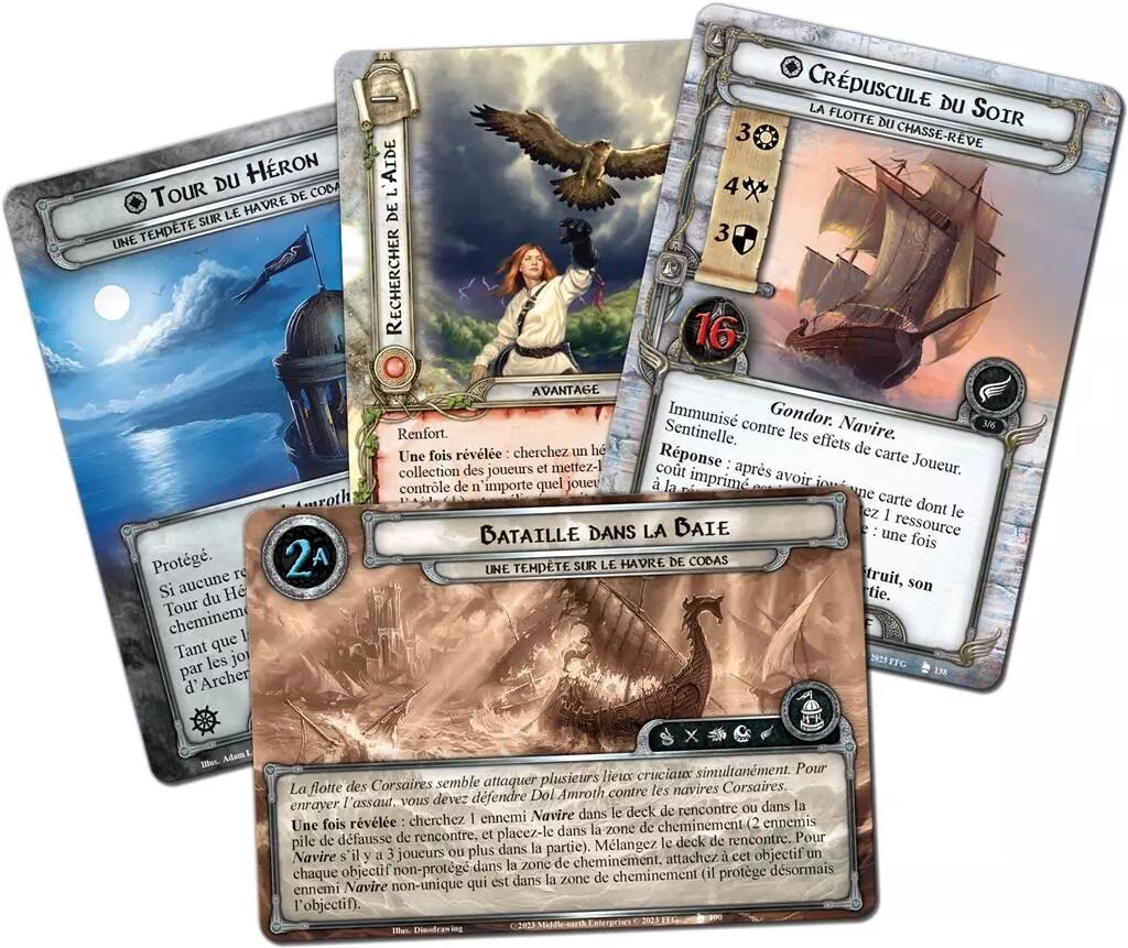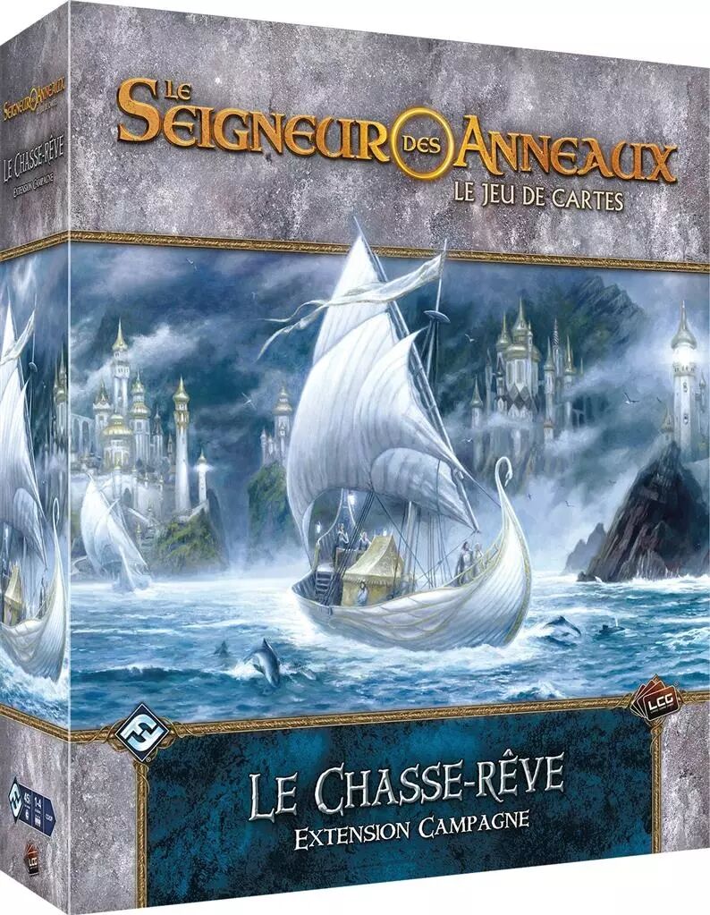 Depuis des millénaires, les Elfes embarquent aux Havres Gris pour sillonner l’océan de l’ouest de la Terre du Milieu dans de magnifiques bateaux blancs, pour souvent ne jamais revenir. Mais une tempête est en train de se lever à l’horizon et une menace plane sur l’île oubliée de Númenor. La Campagne Le Chasse-rêve entraîne de 1 à 4 joueurs à travers les océans de la Terre du Milieu, sur lesquels ils affronteront des Corsaires, exploreront des ruines oubliées de Númenor et protègeront les Havres Gris contre de farouches pillards. À travers neuf scénarios, vos héros devront faire face à des pirates, spectres et monstres marins et déjouer les plans d’un capitaine très persuasif. Cette extension regroupe tous les scénarios précédemment publiés dans la boîte Les Havres Gris et dans le cycle Le Chasse-rêve.