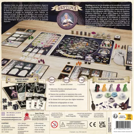 Septima est un jeu de stratégie et de sorcellerie compétitif à forte interaction. En tant que doyenne de votre couvent de sorcières, vous devez prouver votre valeur auprès de vos rivales et des villageois afin d’hériter du titre de Septima, prêtresse suprême de votre ordre. Gagnez de la Sagesse en pratiquant votre art, en collectant des ingrédients pour préparer des potions et en soignant la population, ou apprenez des sorts pour vous assurer le soutien de fidèles au sein du peuple et préserver vos protégées de la vindicte populaire. Car même si elles font parfois office de guérisseuses, les sorcières ne sont pas toujours bien vues par les villageois…