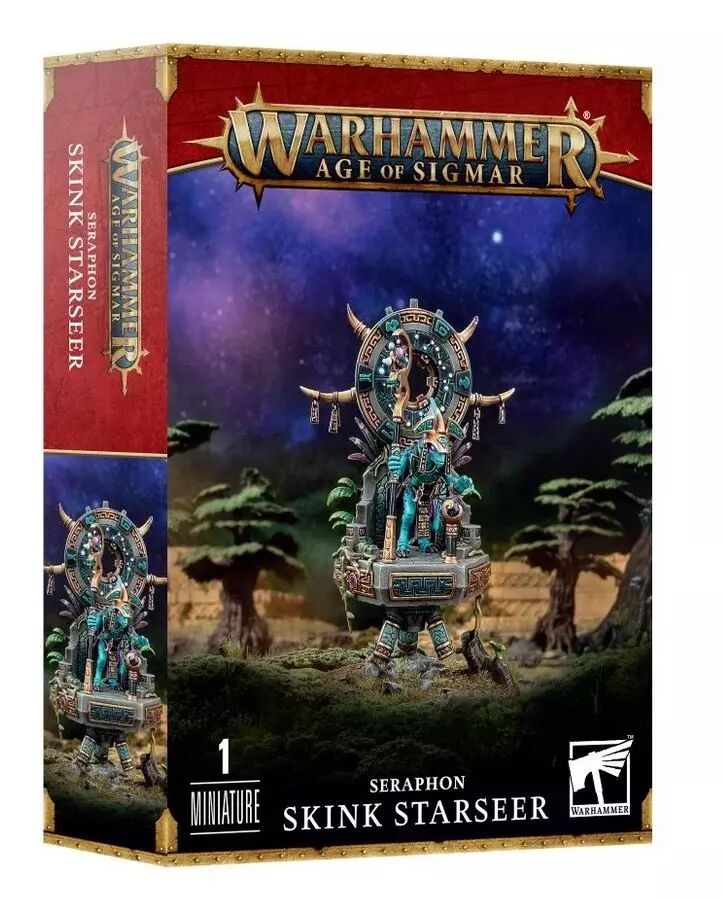 Ce kit plastique permet d'assembler un Astromancien Skink, un astrologue ésotérique sis sur un palanquin flottant. Le kit permet d'assembler l'Astromancien dans deux poses différentes: une dressée et drapée d'une cape de plumes, et une autre assise avec ses robes répandues autour de lui. Ces deux options sont équipées d'un bâton d'astromancien offrant un choix de deux têtes de planétaire, et le kit propose divers colliers ornementaux et coiffes de prêtre.