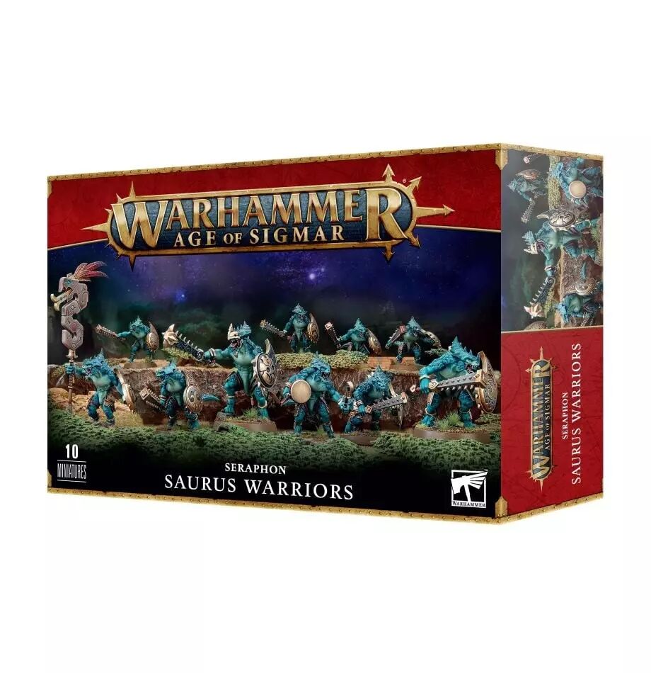 Les Guerriers Saurus forment le cœur brutal des armées de Séraphons. Créées uniquement pour la guerre, ces cohortes reptiliennes avancent sur le champ de bataille d'un pas discipliné et ne déchaînent leur froide sauvagerie qu'au combat. Une fois qu'ils en reçoivent l'ordre, les rangs de Guerriers Saurus se changent en une batteuse faite d'armes en célestite, de mâchoires sauvages et de détermination obsessive.