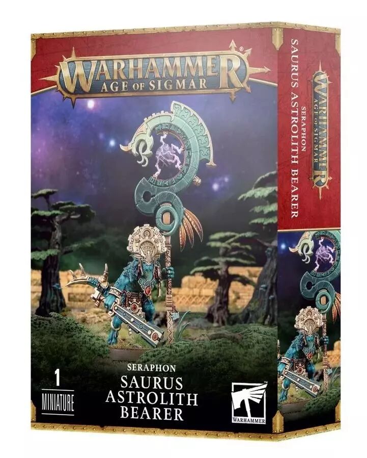 Ce kit plastique permet d'assembler un Porteur d'Astrolithe Saurus, un champion Séraphon à qui a été confié un totem capable de tordre la réalité. Le Porteur d'Astrolithe est engoncé dans une antique armure cérémonielle tirée des chambres des Anciens, et manie une massue de guerre de célestite acérée. L'astrolithe qu'il brandit est gravé de symboles géométriques et astrologiques complexes et il crépite d'une énergie céleste.