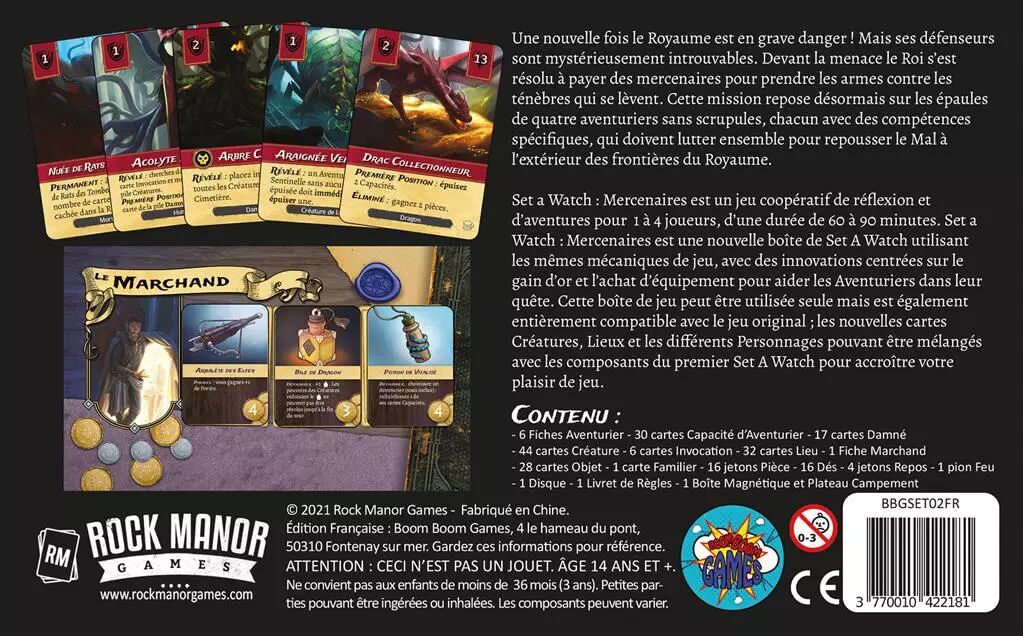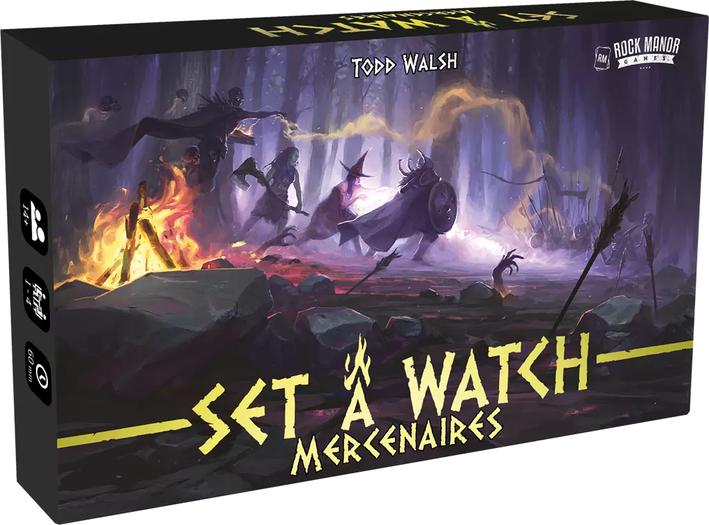 Set a Watch : Mercenaires est un jeu coopératif de Todd Walsh, pour 1 à 4 joueurs, d'une durée de 60mn. Cette boîte est indépendante de son éminente grande soeur, et contient tout le matériel nécessaire pour jouer. Elle reprend les principales mécaniques du premier jeu, ajoute quelques règles pour renforcer le plaisir (les objets à utiliser après les avoir achetés chez le Marchand par exemple) et renouvelle toutes les cartes Personnages, Créatures et Lieux présentes dans la première boîte.