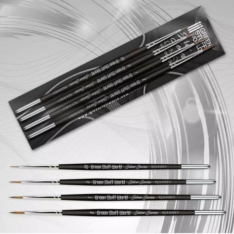 Gamme de pinceaux kolinsky Green Stuff World, SILVER SERIES. Faits à la main avec un manche en bois de haute qualité et une pointe de cheveux naturels Kolinsky, fusionnés par une virole en laiton. Pour les amateurs et les experts, la gamme de pinceaux kolinsky SILVER SERIES fournira une expérience de peinture lisse et nette.