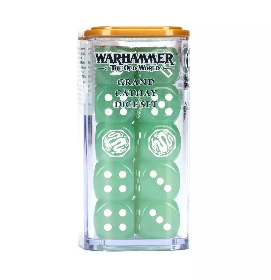 Ce set contient 20 dés à bords adoucis sur le thème du Grand Cathay, à utiliser dans vos parties de Warhammer: The Old World. Ils sont moulés en plastique vert jade et nacré avec des marquages en blanc et mesurent 16mm de côté. Les dés à six faces arborent fièrement une icône de dragon de la faction du Grand Cathay sur la face du 6.