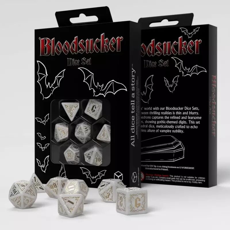 Des profondeurs des cryptes anciennes et des ombres des tombes oubliées émerge le Bloodsucker Dice Set : Immortal, une arme imprégnée du pouvoir de la vie éternelle. Les dés d'un blanc étincelant, ornés de décorations dorées dignes des plus puissantes maisons de vampires, font de ce set un équipement indispensable pour quiconque cherche à manier le pouvoir infini des morts-vivants.