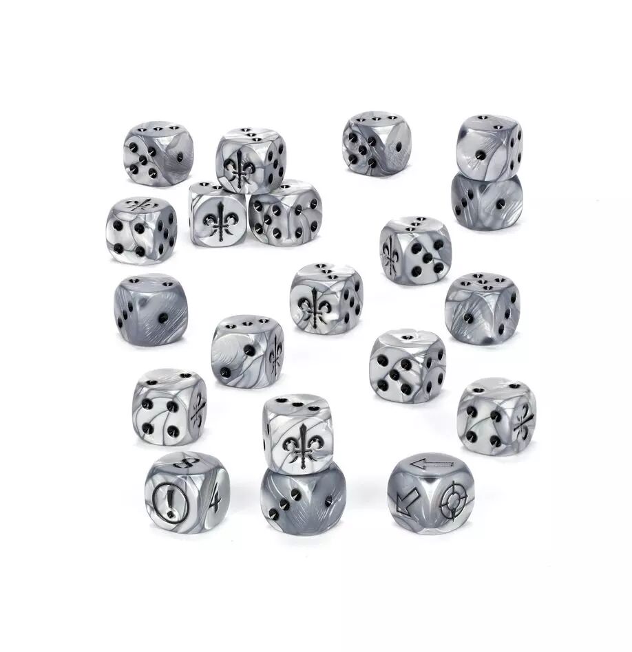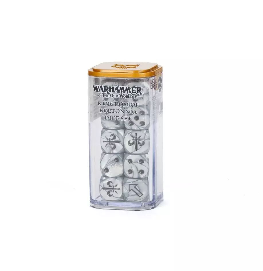 Ce set contient 20 dés sur le thème du Royaume de Bretonnie. Ils sont moulés en plastique aux volutes argentées, avec des marquages noirs. Les D6 arborent fièrement une icône de fleur de lys avec une épée au centre sur la face du 6.