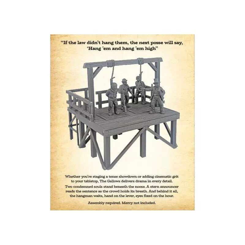 Deux âmes condamnées se tiennent sous le nœud coulant. Un annonceur sévère lit la sentence tandis que la foule retient son souffle. Et derrière tout cela, le bourreau attend, la main sur le levier, les yeux fixés sur l'heure. Maquette en plastique. Échelle 28 mm. Comprend quatre figurines en plastique de 28 mm en plusieurs parties.