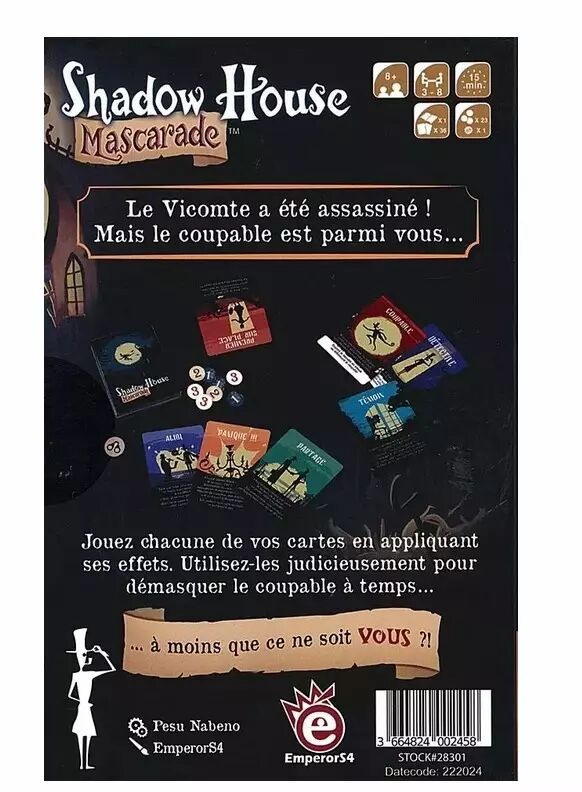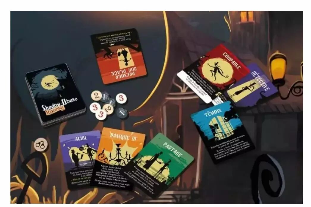 Plongez dans l'atmosphère inquiétante du manoir Shadow. Le vicomte a été assassiné et tout le monde est suspect. Chaque carte et chaque échange renforcent le climat de méfiance et d'intrigue. Avec son thème captivant, Shadow House Mascarade transforme une simple soirée en un véritable roman policier interactif.