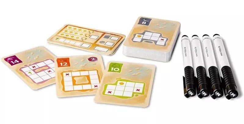 Des cases sont cochées : Les joueurs cochent des cases sur l’une de leurs deux cartes trésor au choix, en fonction du motif de la carte expédition révélée. Le motif peut être tourné de 90° ou 180° ou bien symétrique.