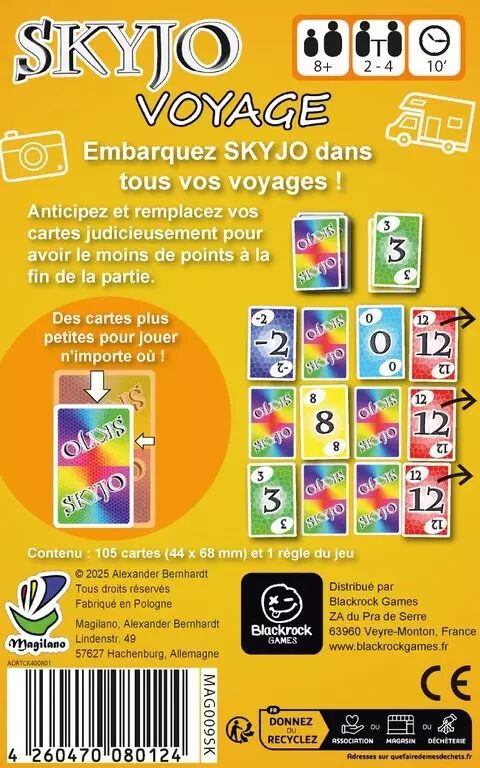 Skyjo Voyage ne change rien à la recette qui a conquis des millions de joueurs, mais il la rend encore plus accessible grâce à son format mini et son prix doux. Limité à 4 joueurs pour plus de fluidité, il se glisse partout et s’installe en un clin d’œil, sans sacrifier la qualité du jeu original. Parfait pour les vacances, les trajets ou les soirées improvisées, il s’adresse aussi bien aux enfants qu’aux adultes en quête d’un jeu rapide, malin et convivial.