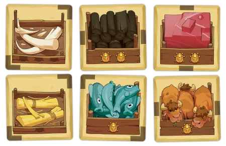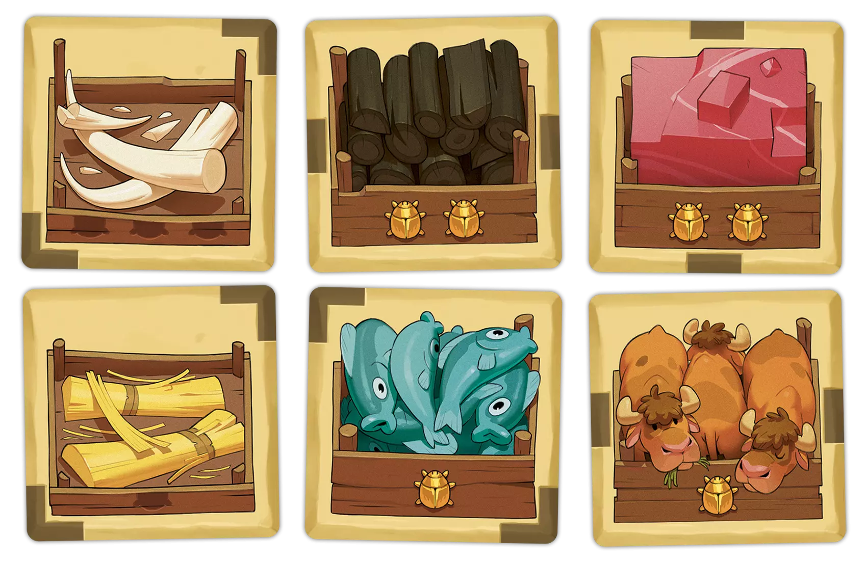 Quand il en a suffisamment, le joueur peut vendre un lot d'au moins 3 tuiles de même type. Ces tuiles lui rapporteront des Points de Victoire en fin de partie, en fonction de leur quantité et du nombre de Scarabées qu'elles présentent. Mais les joueurs peuvent également compter sur les puissants pouvoirs de Personnages pour renverser la tendance.