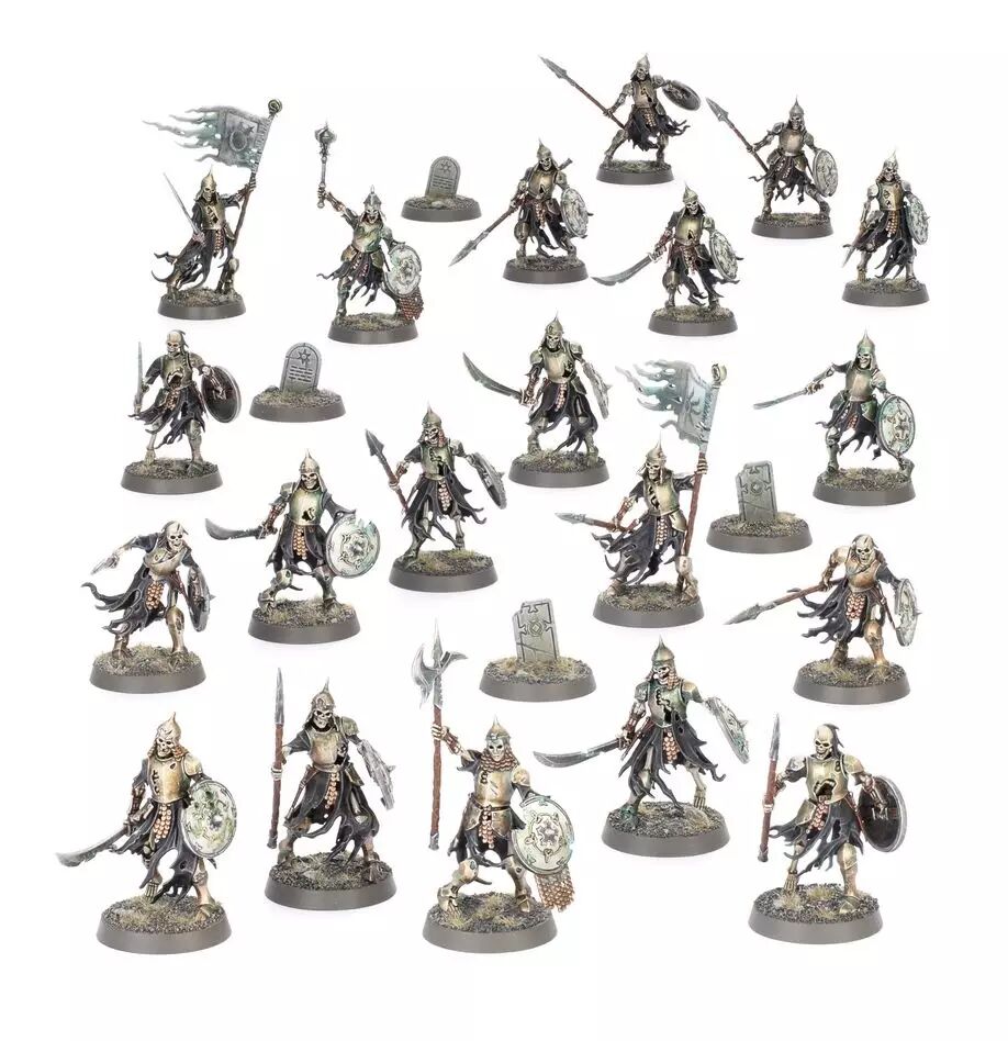 Ils peuvent être assemblés en une seule grande unité ou en deux unités de 10 guerriers, avec chacune son champion et son porte-étendard optionnels. Les champions disposent d'un choix de quatre armes différentes, tandis que les autres Squelettes Raclemorts peuvent être équipés de lances ou d'épées dentelées. Les armes et boucliers sont interchangeables entre les figurines, ce qui vous permet de personnaliser facilement votre légion mort-vivante. Le kit contient également quatre marqueurs Pierre Tombale.