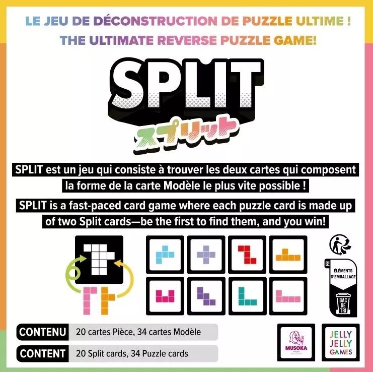 Split est un jeu de puzzle qui met à l'épreuve votre rapidité d'observation et votre sens de l'analyse. Le but du jeu est simple : être le premier à retrouver, parmi les cartes Pièce, la paire qui permet de reproduire la forme de la carte Modèle.