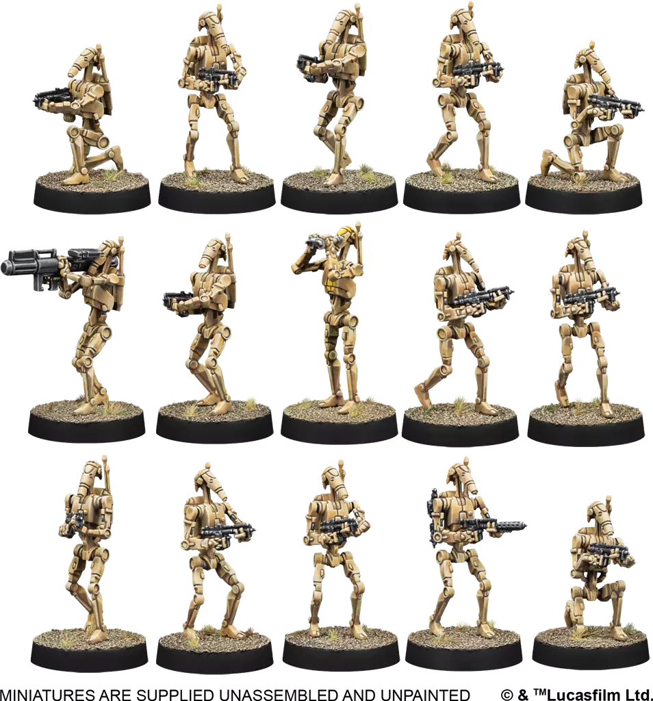 Figurines de droïdes B1 en configuration de combat avec poses tactiques variées.
