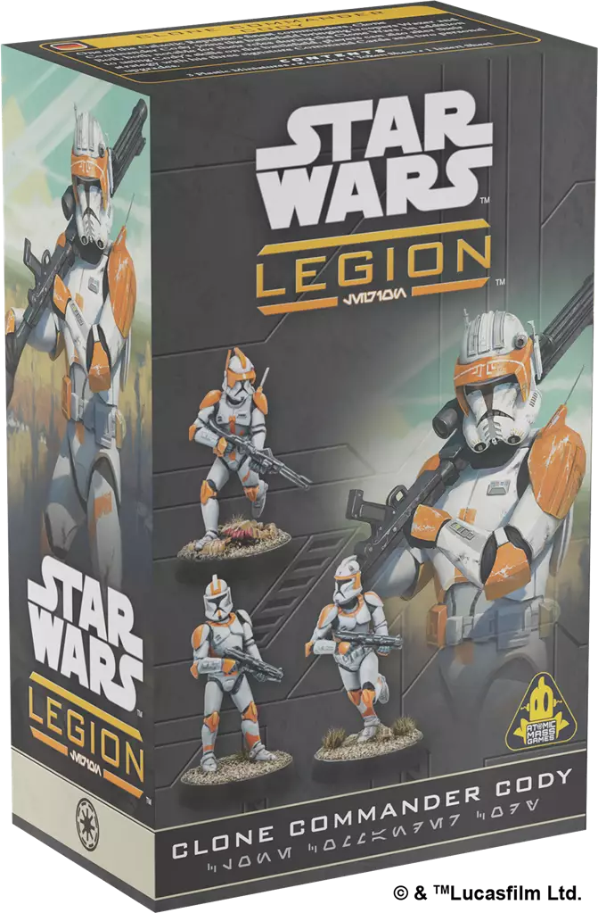 Cody peut être utilisé comme commandant dans la Grande Armée de la République. Il coûte 105 points et dispose d'un nombre respectable de capacités et d'options. Cody est un combattant de mêlée compétent, comme en témoigne son entraînement au combat avancé. Lorsqu'il attaque à distance, son fusil blaster DC-15A lui donne un nombre respectable de dés d'attaque : 2 rouges, 1 noir et 1 blanc, ainsi qu'Impact 1 et Létal 1. Capable de commander une bataille à son point le plus crucial, Observer 2, Se mettre à couvert 1 et Diriger : Véhicule sont des capacités qui reflètent ses prouesses en tant que commandant du 7e corps du ciel. Enfin, son expérience du combat et son équipement lui donnent accès à Cible 1 et Surge : Critique, Saut 1 et Dés de défense rouge.