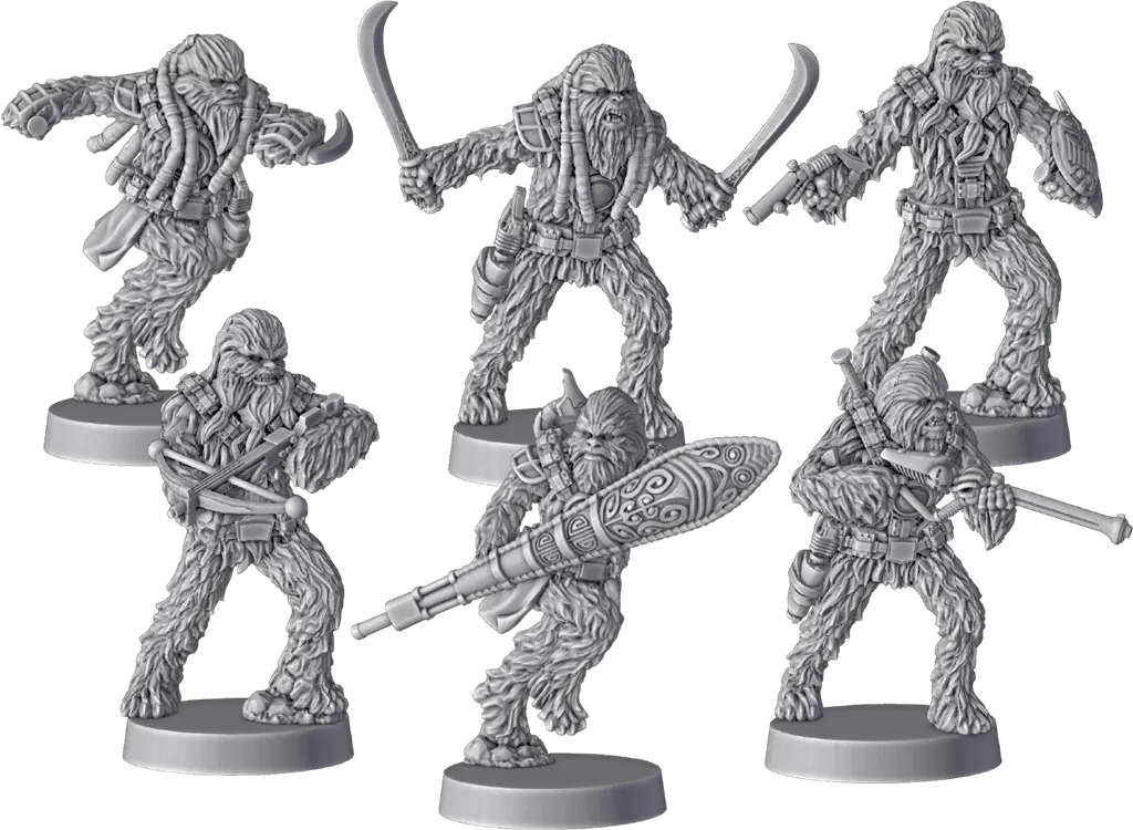 L'extension d'unité met à votre disposition six figurines Wookies qui peuvent être assemblées et utilisées de différentes manières, notamment comme unité à courte portée portant des lames ryyk et des pistolets Kashyyk, ou bien comme unité de tireurs d'élite Wookiee tirant avec des carabines X1.