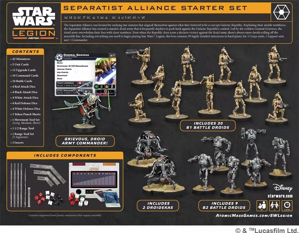 L’Alliance séparatiste est constituée de systèmes stellaires périphériques qui se sont regroupés pour lutter contre une République Galactique qu’ils considèrent corrompue. Exploitant une main d’œuvre considérable, l’Alliance Séparatiste a créé une imposante armée de droïdes qu’elle déploie fréquemment pour réduire l’influence de la République Galactique. Sous le commandement de l’impitoyable Général Grievous, l’armée droïde submerge les troupes ennemies par son nombre. Même lorsque la République remporte une victoire décisive contre l’armée droïde, il y a toujours plus de droïdes qui sortent des chaînes de montage. Cette Boîte de Démarrage contient tout ce dont vous avez besoin pour commencer à jouer à Star Wars : Legion. Les 39 figurines finement sculptées en plastique dur vous permettront de constituer 3 unités de Battle Droïds, 1 unité de Soutien et 1 Commandant (General Grievous).