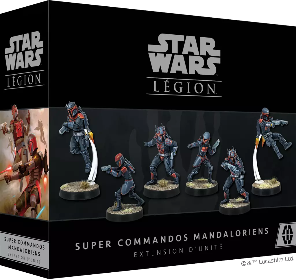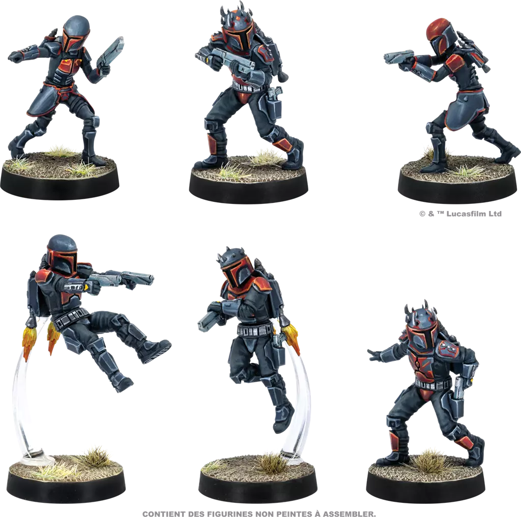 Les Super Commandos Mandaloriens sont une unité bien équipée, avec de nombreux mots-clés pour renforcer leur statut de forces spéciales du Collectif de l'Ombre. Unités de vitesse 3 très mobiles, ils disposent d'une flopée d'options défensives avec à la fois Saut 2 et Défense. Imperméable et une poussée défensive ne font que compléter ces avantages, ce qui signifie que les Super Commandos vont avoir beaucoup de protection lorsqu'ils avancent sur le champ de bataille. Indépendant : Visée 1 donne aux Super Commandos Mandaloriens un coup de pouce utile lorsqu'ils opèrent seuls. Sur le plan offensif, ils disposent de nombreuses options pour engager leurs ennemis à presque n'importe quelle distance : la carabine blaster Galar-15, les pistolets blaster Westar-35 et leur expertise en combat de mêlée fournissent le soutien nécessaire pour atteindre les objectifs de leur commandant.