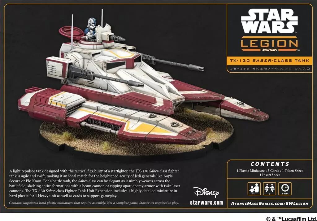 Tank léger à répulseurs, aussi adaptable tactiquement que peut l’être un chasseur stellaire, le TX-130 de Classe Saber est à la fois maniable et rapide, ce qui en fait le véhicule idéal des généraux Jedi de la République Galactique, comme Aayla Secura et Plo Koon. Doté d’avantages tactiques, il se déplace aisément sur le champ de bataille, décimant des formations entières grâce à son canon à rayons ou déchiquetant les blindages ennemis avec ses canons laser jumelés. Cette extension contient 1 figurine finement sculptée à assembler, en plastique dur, qui vous permettra de constituer 1 unité lourde, ainsi que toutes les cartes dont vous aurez besoin.