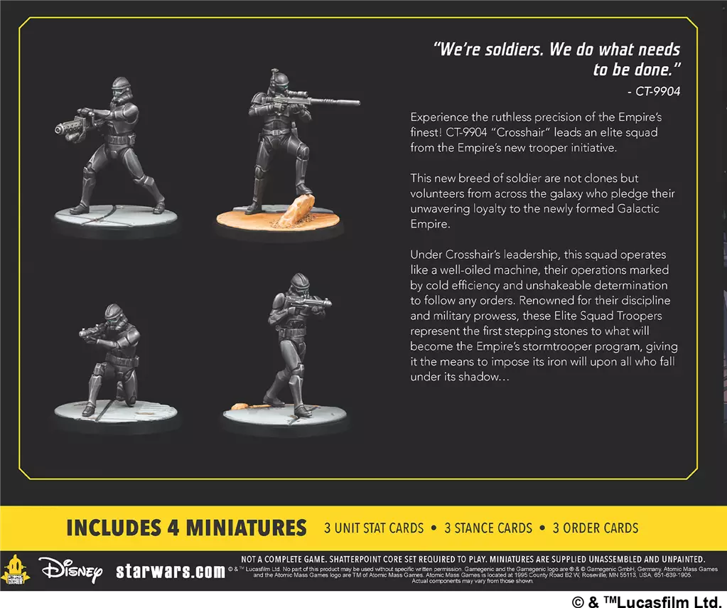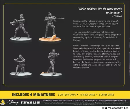 Sous le commandement de Crosshair, cette escouade parfaitement rodée mène ses opérations avec une efficacité redoutable et une détermination sans faille, dans le respect scrupuleux des ordres donnés. Réputés pour leur discipline et leurs prouesses militaires, ces soldats d’élite sont la première pierre de ce qui deviendra le programme stormtrooper de l’Empire, lui donnant les moyens d’imposer sa volonté de fer à tous ceux qui tombent sous sa coupe…