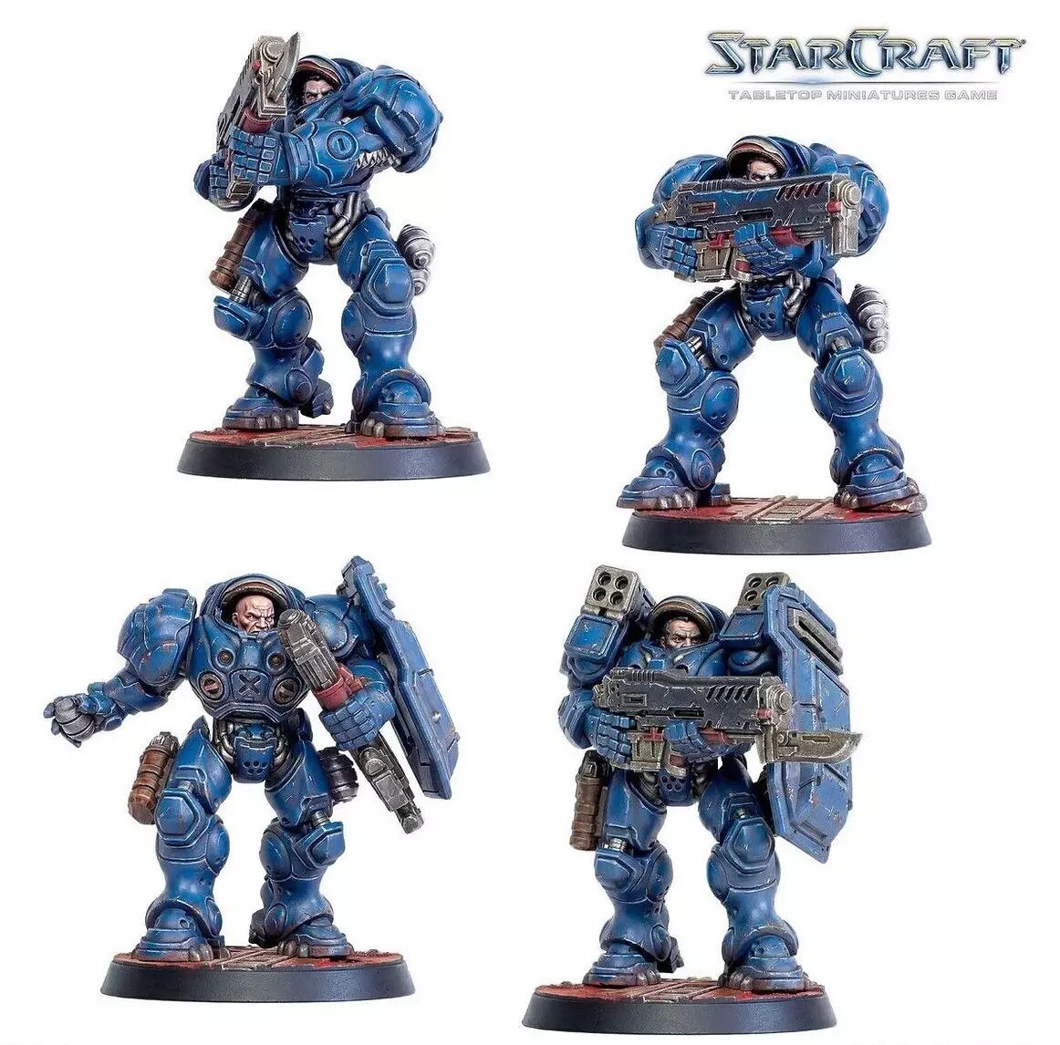 12 Marines Terrans : Figurines multi-poses en plastique haute densité (HIPS) bleu.