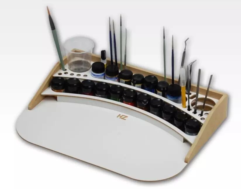 La station de peinture HZ-sdm1 comporte deux longues fentes de 36 mm de large pour le rangement des pots et des flacons de peinture, plus d'une douzaine de trous de formes différentes pour les pinceaux et les outils, et elle est même équipée de deux porte-gobelets intégrés !