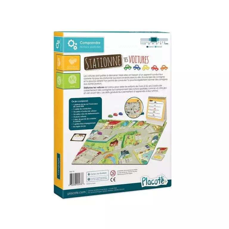 Jeu gradué conçu pour aider l’enfant à développer sa compréhension des notions spatiales. Le jeu comprend un plateau sous forme de casse-tête, 40 défis, 10 voitures de couleurs différentes, un bloc de permis de conduire à colorier et des cartes « couleur de voiture » et « lieu de stationnement ».
