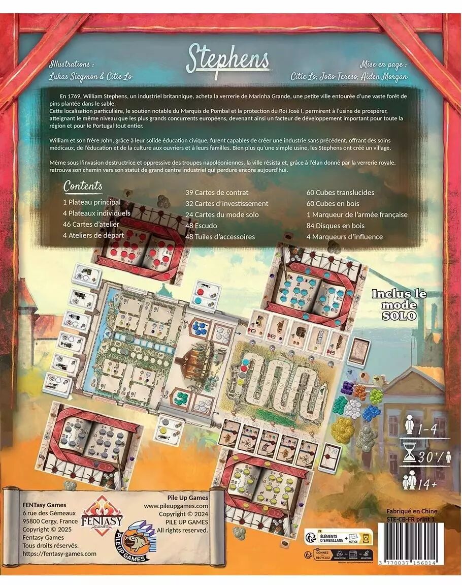 Inspiré de la véritable histoire de William Stephens, ce jeu retrace la transformation de la verrerie de Marinha Grande en un leader européen. Les joueurs incarnent des maîtres verriers qui doivent construire leur prestige à travers une gestion habile, des investissements judicieux, et un travail constant pour former leur main-d’œuvre et honorer des contrats.