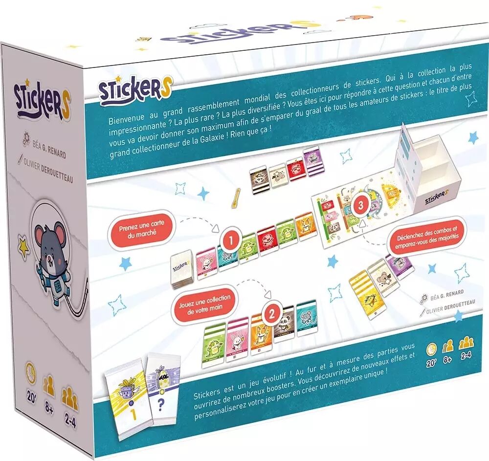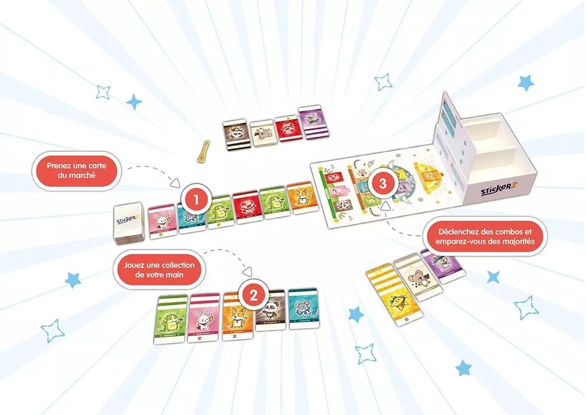Les règles de Stickers sont à la fois simples et stratégiques. À chaque tour, un joueur doit choisir une carte de la rivière tout en posant des cartes de sa main pour élargir sa collection. Selon le nombre de cartes posées, des actions supplémentaires sont possibles, créant ainsi des opportunités de renverser la situation. La notion de combo, où chaque action en entraîne une autre, apporte une couche de complexité qui ravira les amateurs de jeux de société. Le système de points basé sur la rareté des collections incite à la compétition tout en maintenant un esprit ludique.