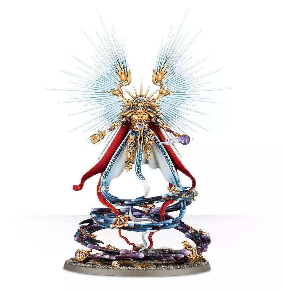 La colère du Dieu-Roi. L'Ange Vengeur d'Azyr. Le Porteur du Marteau Monde. Le Premier Fils de Sigmar - tel est le Celestant-Prime. Grand roi et défenseur des hommes au temps de sa vie de mortel, il a été prodigieusement galvanisé par la puissance divine de Sigmar; et pourtant, ce don de pouvoir ne s'arrête pas là. Désormais nanti du Fendeur de Crânes, le Grand Broyeur Ghal Maraz, le Celestant-Prime rugit de fureur à travers les champs de bataille des Royaumes, tel un appel aux armes retentissant. L'impact fracassant de Ghal Maraz peut tuer net un démon, bannissant son esprit vers le Royaume du Chaos.