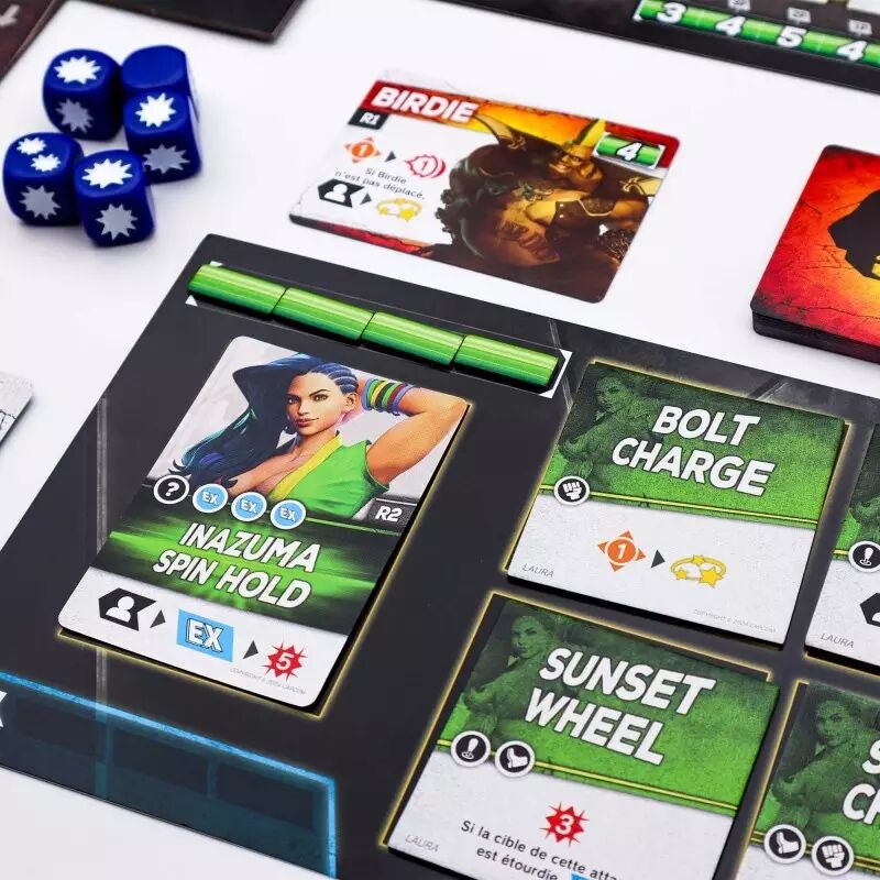 Tu débutes contre des minions faibles, puis un rival te poursuit depuis le début, tu affrontes différents boss par étape. Le plateau est petit, les ennemis arrivent tout le temps. C'est serré, c'est intense, c'est l'action non-stop de Street Fighter reproduite en jeu de société. Tu gagnes de l'expérience en tuant des ennemis ou en remplissant tes objectifs. Cette expérience devient cruciale : tu l'utilises pour booster une attaque, relancer les dés, ou accumuler trois points pour débloquer une version améliorée de ta capacité. Si tu réussis à tout améliorer, tu déverrouilles ta super attaque ultime.