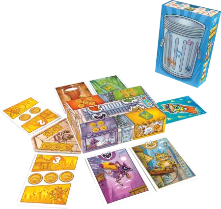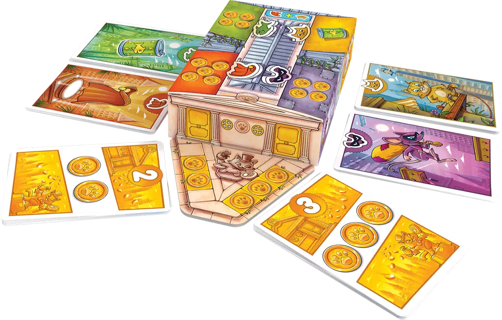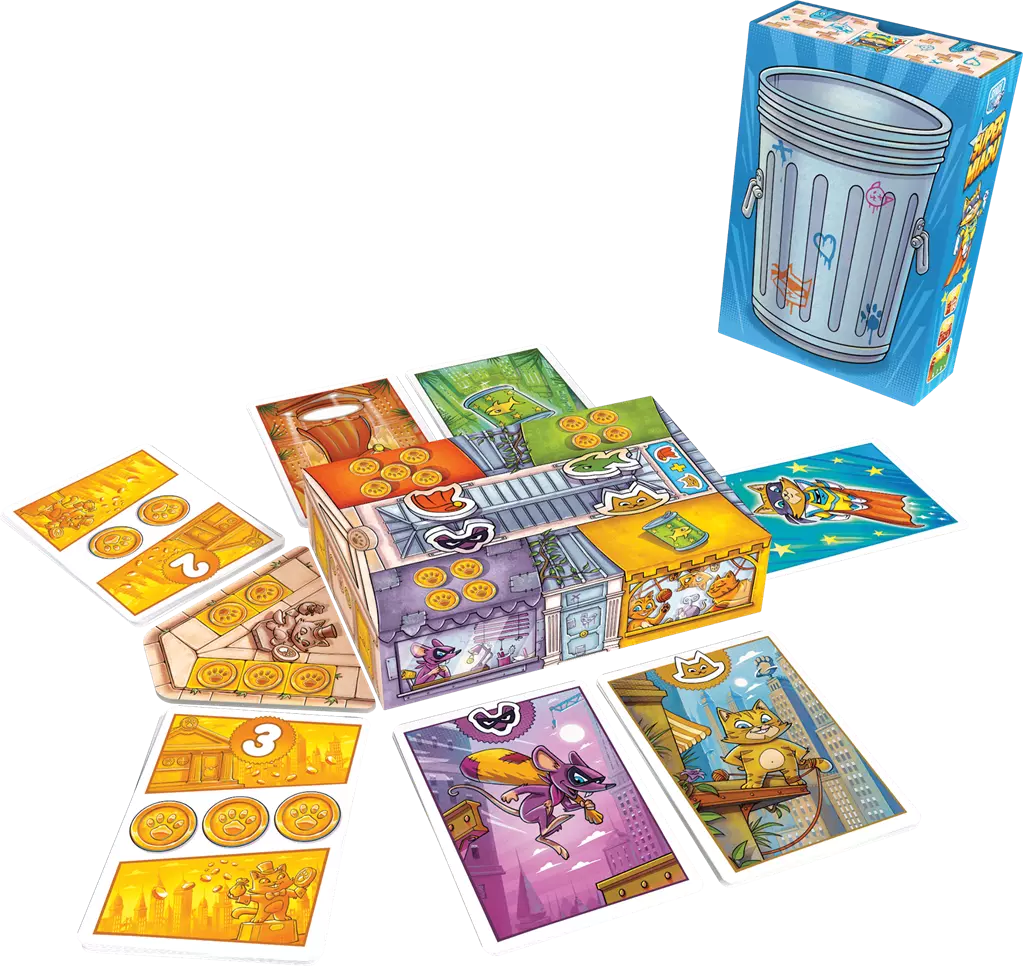 À partir des mêmes cartes de départ, chaque joueur compose sa propre pioche en achetant de nouvelles cartes au marché ou à la banque. Soyez le premier à révéler une carte Chat et une carte Cape pour recruter Super Miaou et gagner la partie ! Une initiation au jeu de construction de decks dès 6 ans !