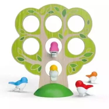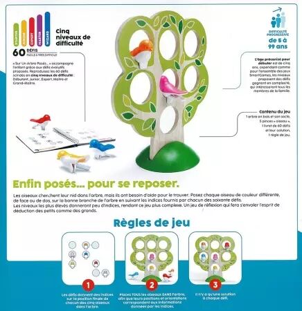 Dans la boîte : 1 arbre en bois et son socle, 5 pinces « oiseau », 1 livret de 60 défis et leur solution, 1 règle de jeu