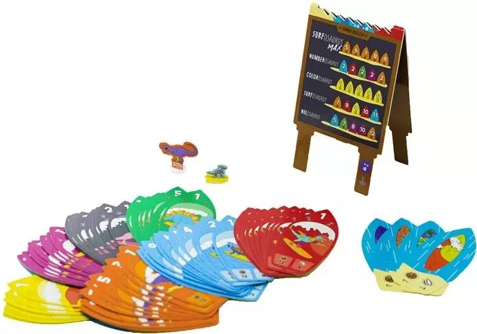 Imaginez des dinosaures sur des planches de surf, dans un décor flashy digne des années 90. L’esthétique de Surfosaurus Max ne passe pas inaperçue. Les cartes en forme de planches et le chevalet Dino Beach ajoutent une touche de fun visuel qui séduit dès la première partie.