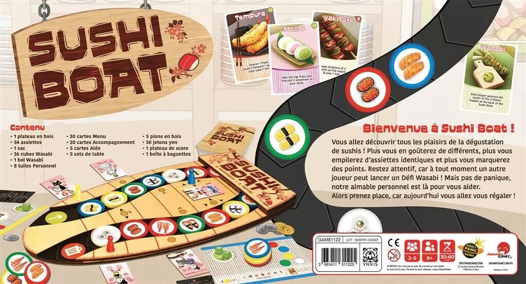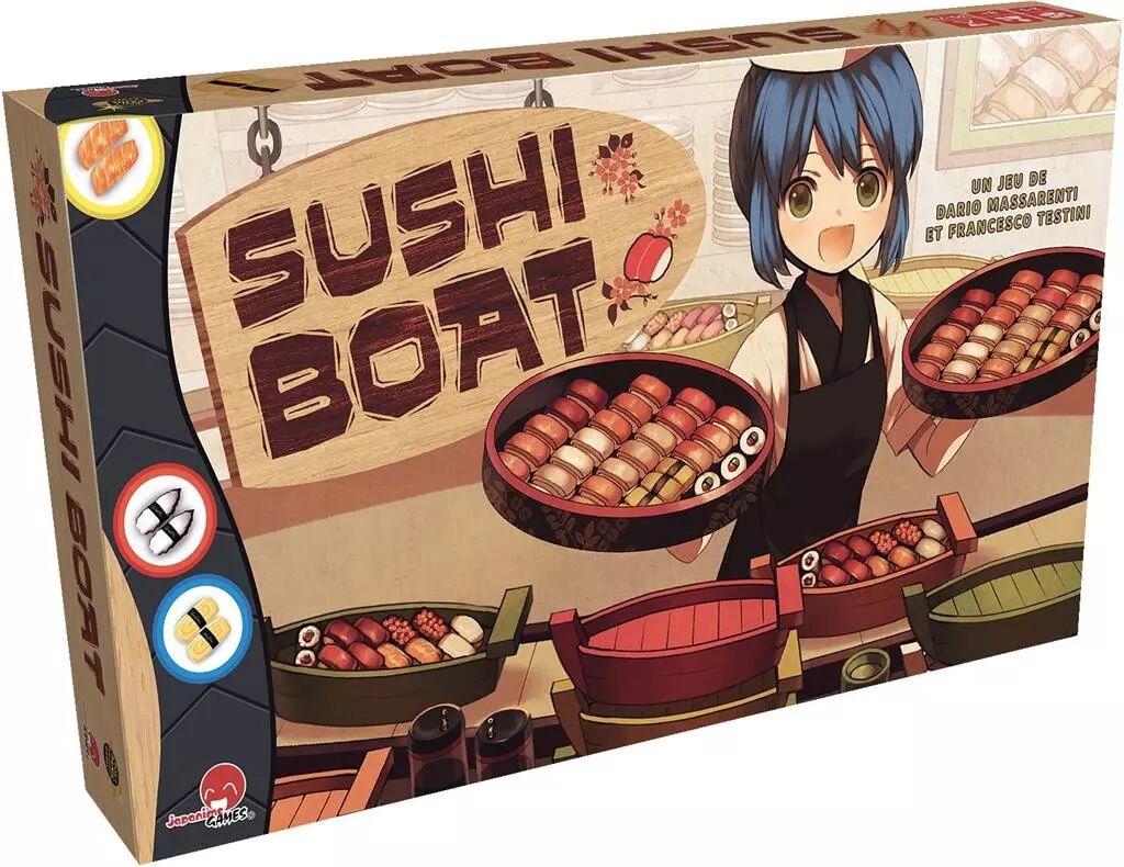Sushi Boat est un jeu où il faut manger de délicieux sushis ! À votre tour, vous placerez votre pion sur une case libre et accomplirez 2 actions : gagner 1 yen, utiliser la compétence d’un membre du personnel ou, encore mieux, manger un sushi ! Empilez les assiettes que vous avez mangées devant vous.