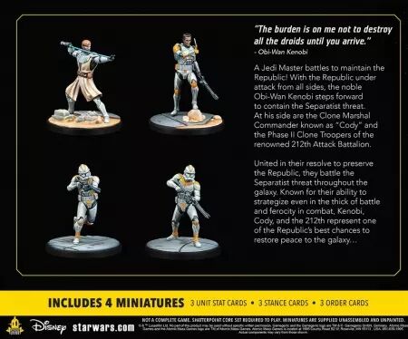 Un Général Jedi Iconique et ses alliés entrent dans les duels de Star Wars : Shatterpoint dans ce set ! Obi-Wan Kenobi, l’un des héros les plus emblématiques de la République, se bat pour contenir la menace Séparatiste quel qu’en soit le prix. Ce set l’ajoute à Star Wars Shatterpoint, ainsi que le Commandant Clone Cody et deux soldats Clones de la phase II du célèbre 212eme bataillon d’attaque. Qu’elles soient utilisées ensemble en tant qu’escouade complète ou combinées avec d’autres personnages, les figurines magnifiquement sculptées de ce pack sont accompagnées de toutes les cartes dont les joueurs ont besoin pour libérer leurs capacités uniques sur le champ de bataille.