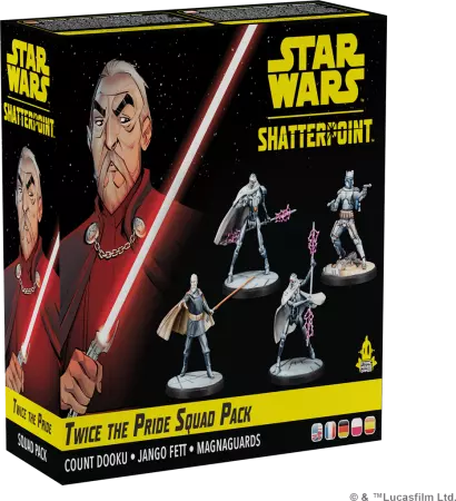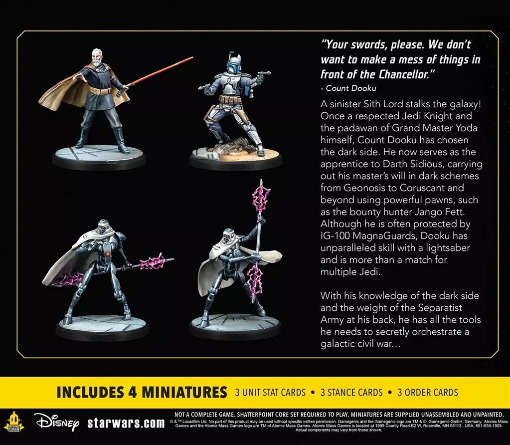 Un sinistre seigneur Sith et ses serviteurs entrent dans les duels de Star Wars : Shatterpoint ! Autrefois Chevalier Jedi respecté et padawan du Grand Maître Yoda lui-même, le comte Dooku a choisi le côté obscur, devenant l’apprenti de Dark Sidious lui-même. Ce set ajoute à Star Wars : Shatterpoint une nouvelle escouade composée du Comte Dooku, de Jango Fett et de 2 Magna Gardes IG-100 que les joueurs peuvent jouer immédiatement ou utiliser avec d’autres personnages pour créer leur propre escouade. En plus de figurines magnifiquement sculptées des quatre personnages, les joueurs trouveront également toutes les cartes dont ils ont besoin pour donner vie à ces personnages sur le plateau de jeu.