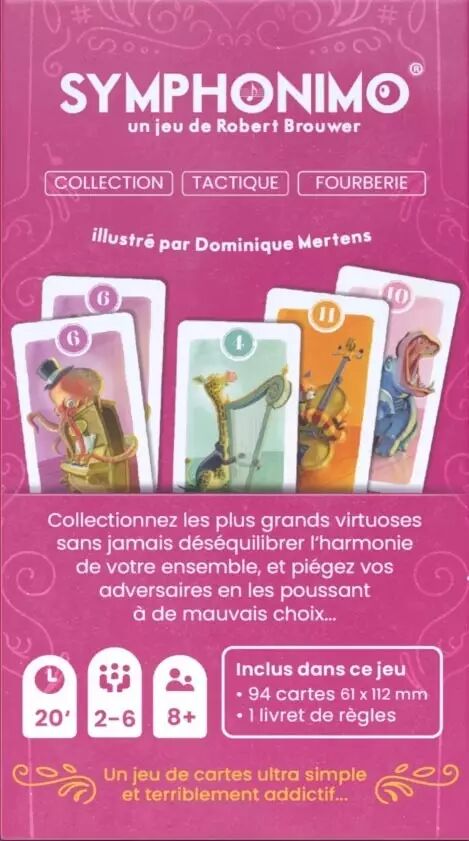 Avec ses 94 cartes, Symphonimo se joue rapidement et est parfait pour les familles ou entre amis. Les joueurs placent des cartes musiciens sur des chefs d'orchestre, et doivent choisir le moment idéal pour récupérer les cartes. Seuls les solistes et quatuors rapportent des points. La simplicité des règles le rend idéal pour les jeunes joueurs, tout en restant stimulant pour les plus grands.