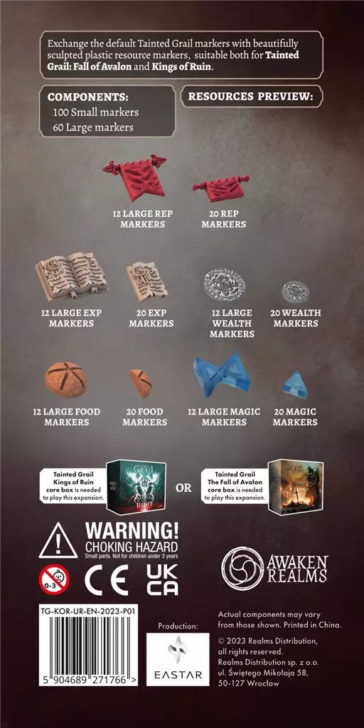Contient 12 grand marqueurs rouges, 20 petits marqueurs rouges, 12 grands marqueurs d’expérience, 20 petits marqueurs d’expérience, 12 grands marqueurs Nourriture, 20 petits marqueurs Nourriture, 12 grands marqueurs Magie, 20 petits marqueurs Magie, 12 grands marqueurs Richesse, 20 petits marqueurs Richesse.