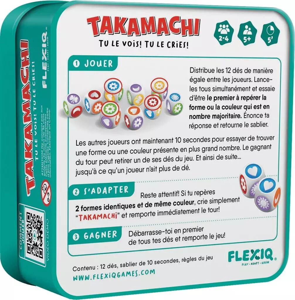 12 dés, 1 sablier de 10 secondes et 1 règle de jeu