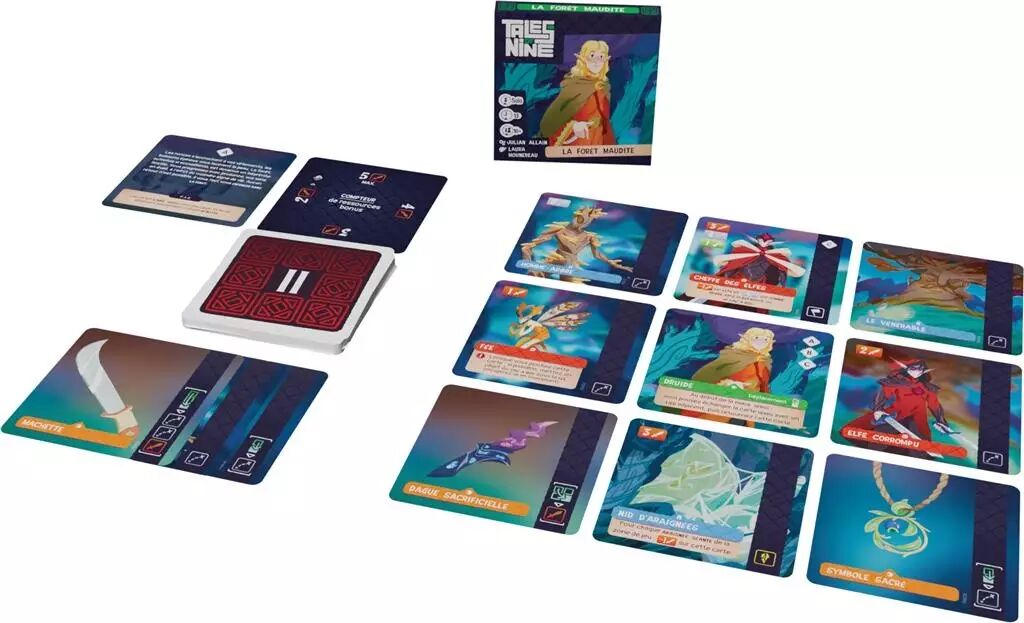 Chaque boîte de Tales of Nine contient 3 chapitres d’une histoire à découvrir sous forme de cartes. Huit d’entre elles sont placées autour de la carte Héros, formant la région ou le donjon à explorer. Déplacez votre héros en utilisant son mouvement de base ou une carte précédemment acquise. Affrontez les monstres en dépensant les ressources nécessaires et venez à bout de chaque chapitre en accumulant des trésors et en visitant les différents lieux.